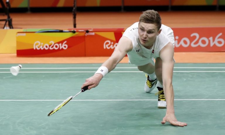 Dánsky bedmintonista Viktor Axelsen počas zápasu o bronz proti Číňanovi Lin Danovi. Rio de Janeiro, 20. august 2016. Foto: SITA/AP