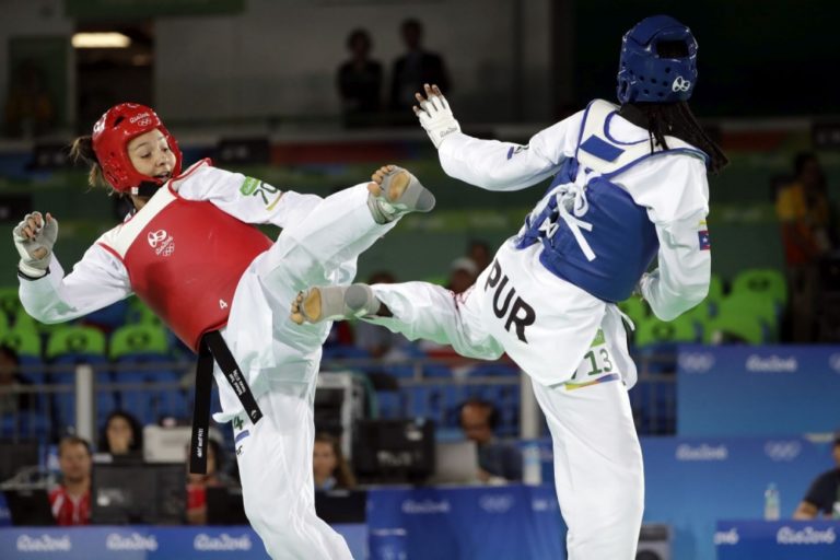 Crystal Brittany Weekes z Portorika v súboji s Američankou Jackie Gallowayovou počas zápasu o bronz v taekwonde v kategórii do 67 kg. Rio de Janeiro, 20. august 2016. Foto: SITA/AP