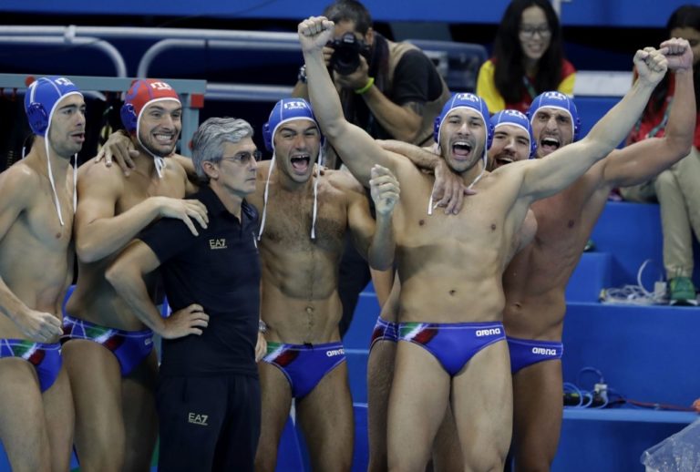 Talianski vodní pólisti sa radujú z triumfu nad reprezentatmi Čiernej Hory v zápase o bronzové medaily. Rio de Janeiro, 20. august 2016. Foto: SITA/AP