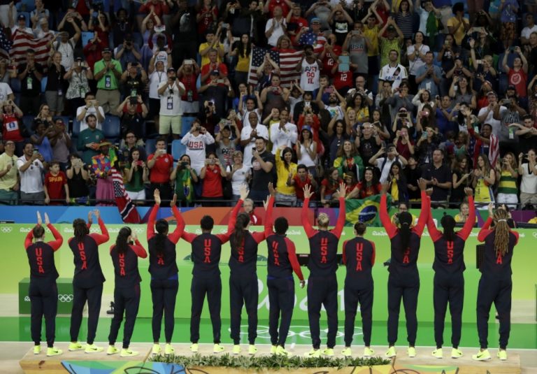 Americké basketbalistky pózujú fotografom po finálovom zápase, v ktorom deklasovali Španielky a šiestykrát po sebe sa tešia z olympijského zlata. Rio de Janeiro, 20. august 2016. Foto: SITA/AP