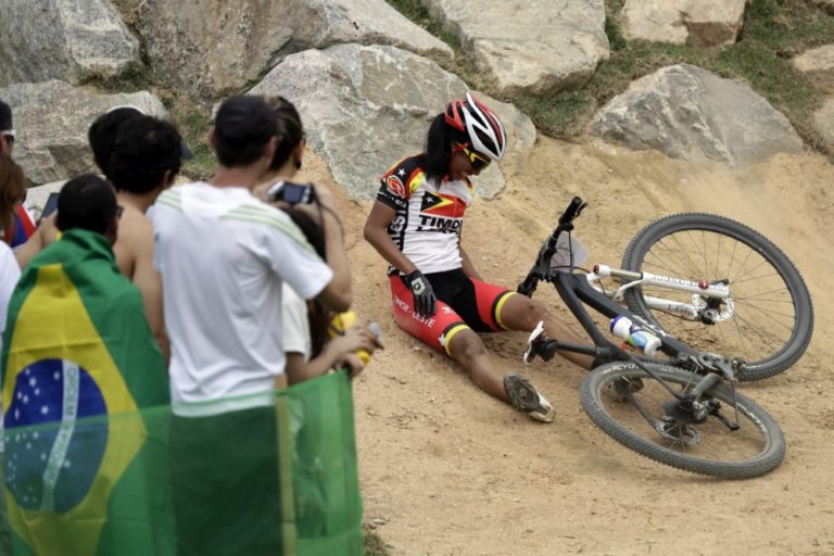 Pád Franceliny Cabralovej v pretekoch cross country žien. Rio de Janeiro, 20. august 2016. Foto: SITA/AP