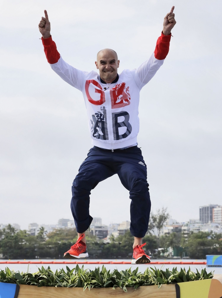 Brit Liam Heath sa teší na stupňoch pre víťazov po finále K1 na 200 m, ktoré vyhral. Rio de Janeiro, 20. august 2016. Foto: SITA/AP