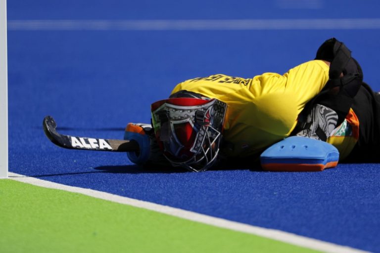 Indický brankár Sreejesh Parattu počas zápasu turnaja v pozemnom hokeji proti Holanďanom. Rio de Janeiro, 11. august 2016. Foto: SITA/AP