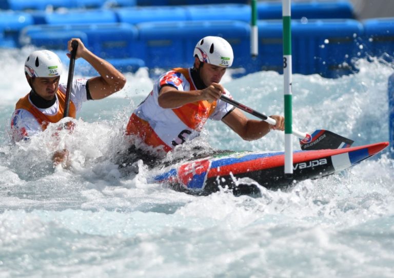 Slovenskí deblkanoisti Ladislav Škantár a Peter Škantár počas semifinálovej jazdy disciplíny C2. Rio de Janeiro, 11. august 2016. Foto: SITA/Martin Medňanský