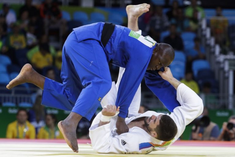 Francúzsky reprezentant Cyrille Maret v súboji s Ayoubom Traorem z Mali počas zápasu v kategórii do 100 kg. Rio de Janeiro, 11. august 2016. Foto: SITA/AP