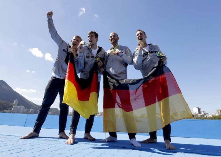 Zlatú medailu v párovej štvorveslici získalo nemecké kvarteto Philipp Wende, Lauritz Schoof, Karl Schulze a Hans Gruhne. Rio de Janeiro, 11. august 2016. Foto: SITA/AP