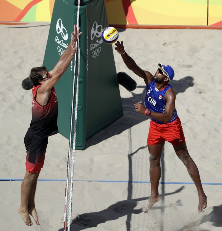 Kanadaň Ben Saxton sa snaží zablokovať loptu po zakončení Kubánca Sergia Gonzaleza Bayarda počas zápasu olympijského turnaja v plážovom volejbale. Rio de Janeiro, 11. august 2016. Foto: SITA/AP