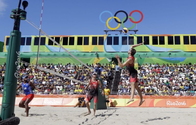 Kanadský plážový volejbalista Chaim Schalk sleduje svojho spoluhráča smečujúceho Bena Saxtona počas zápasu olympijského turnaja. Rio de Janeiro, 11. august 2016. Foto: SITA/AP