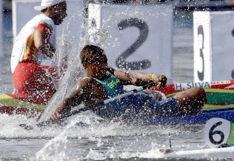 Brazílsky reprezentant Isaquias Queiroz Dos Santos v závere rozjazdy K2 na 200 m. Rio de Janeiro, 17. august 2016. Foto: SITA/AP