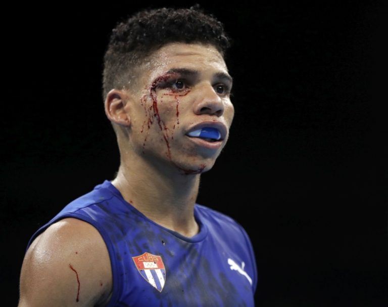 Zakrvavený kubánsky boxer Yosbany Veitia počas súboji s Číňanom Hu Jianguanom v kategórii do 52 kg. Rio de Janeiro, 17. august 2016. Foto: SITA/AP