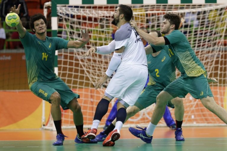 Francúzsky hádzanár Nikola Karabatič v súboji s Brazílčanmi počas štvrťfinálového zápasu hádzanárskeho turnaja. Rio de Janeiro, 17. august 2016. Foto: SITA/AP