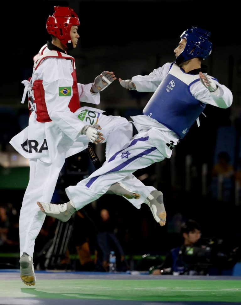 Izraelský reprezentant Ron Atias v súboji s Brazílčanom Veniltonom Teixeirom počas zápasu v taekwonde. Rio de Janeiro, 17. august 2016. Foto: SITA/AP
