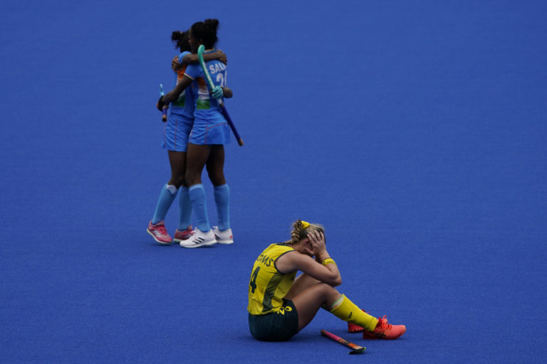 Austrálska hokejista má Mariah Williamsová má hlavu v smútku po prehre v pozemnom hokeji s Indiou na letnej olympiáde v Tokiu. Tokio, 2. august 2021. Foto: SITA/AP.