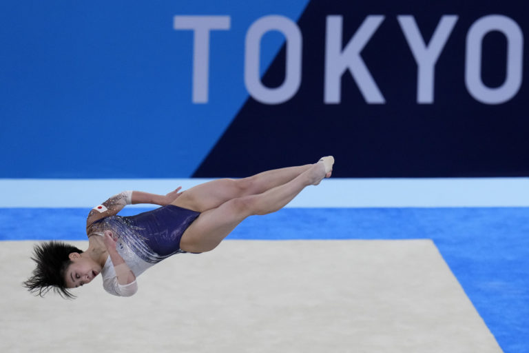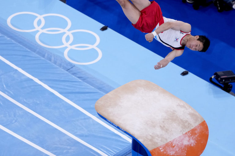 Juhokórejský gymnasta Shin Jea-hwan počas premetu v umeleckej gymnastike na letnej olympiáde v Tokiu. Tokio, 2. august 2021. Foto: SITA/AP