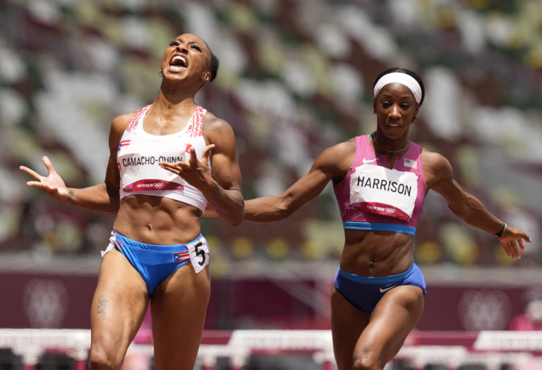 Radosť bežkyne z Portorika Jasmine Camacho-Quinnovej, ktorá získala zlato v behu na 100 m cez prekážky na letnej olympiáde v Tokiu. Tokio, 2. august 2021. Foto: SITA/AP.