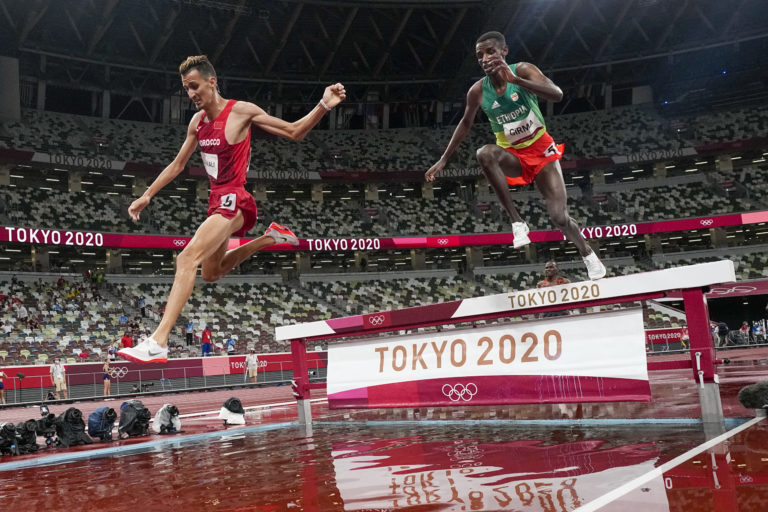 Marocký reprezentant Soufiane El Bakkali (vľavo) vyhral beh na 3 000 m cez prekážky na letnej olympiáde v Tokiu. Tokio, 2. august 2021. Foto: SITA/AP