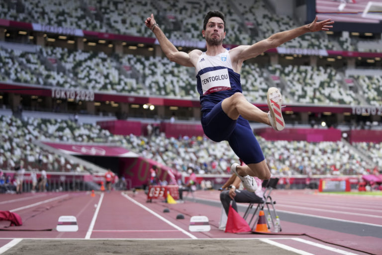 Grécky reprezentant Miltiadis Tentoglou vyhral zlatú medailu v skoku do diaľky mužov na letnej olympiáde v Tokiu. Tokio, 2. august 2021. Foto: SITA/AP.