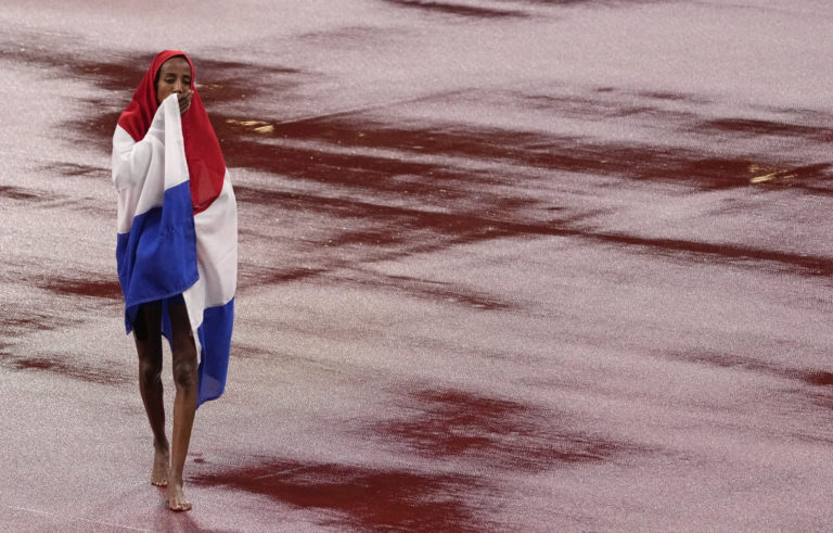 Holandská reprezentantka Sifan Hassanová sa teší zo zlatej medaily v behu žien na 5 000 metrov na letnej olympiáde v Tokiu. Tokio, 2. august 2021. Foto: SITA/AP.