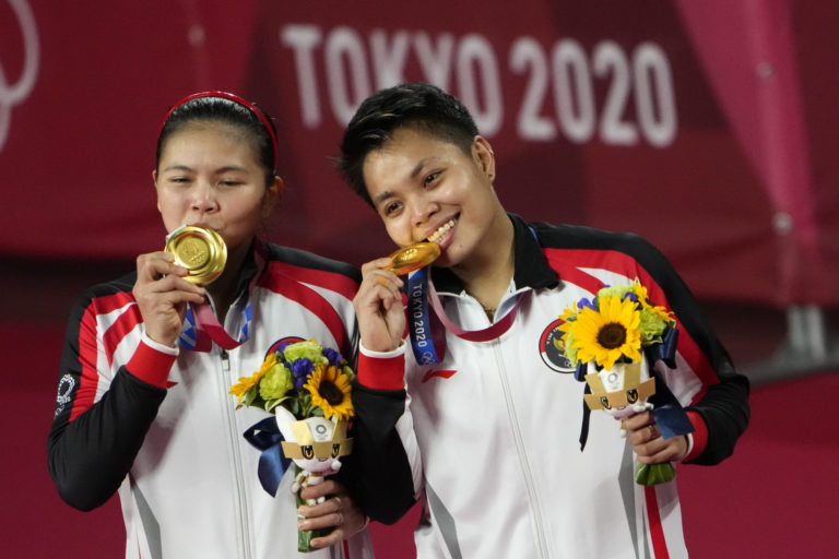 Indonézske bedmintonistky Greysia Poliiová (vľavo) a Apriyani Rahayuová získali zlatú medailu vo štvorhre žien na letnej olympiáde v Tokiu. Tokio, 2. august 2021. Foto: SITA/AP: