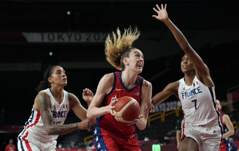 Americká basketbalistka Breanna Stewart (10) sa snaží s loptou dostať cez Francúzky na letnej olympiáde v Tokiu. Tokio, 2. august 2021. Foto: SITA/AP.