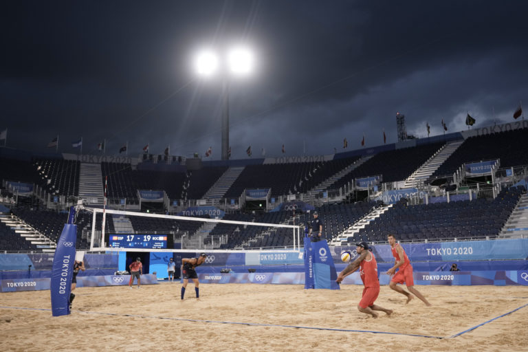 Ruský plážový volejbalista Viačeslav Krasilnikov (druhý sprava) so svojím spoluhráčom Olegom Oleg Stoyanovskiym (vpravo) počas zápasu v plážovom volejbale proti Španielom na letnej olympiáde v Tokiu. Tokio, 2. august 2021. Foto: SITA/AP.