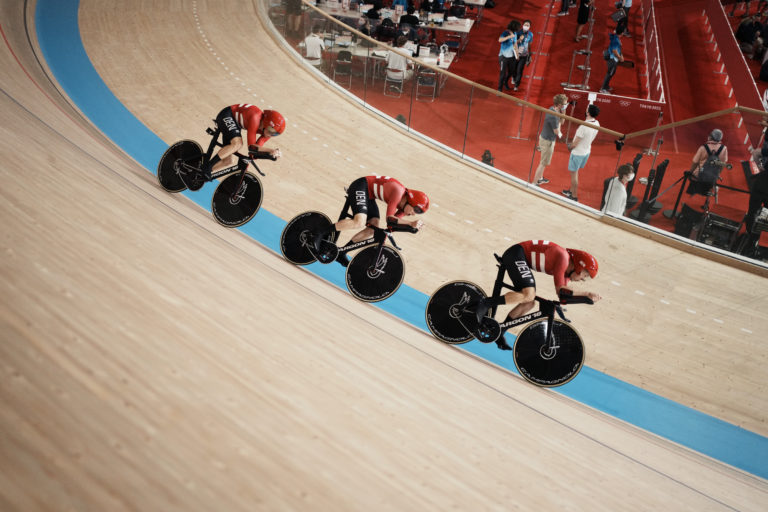 Dánski dráhoví cyklisti vytvorili olympijský rekord v tímovej stíhačke, ktorý má hodnotu 3:45,014 na letnej olympiáde v Tokiu. Izu, 2. august 2021. Foto: SITA/AP.