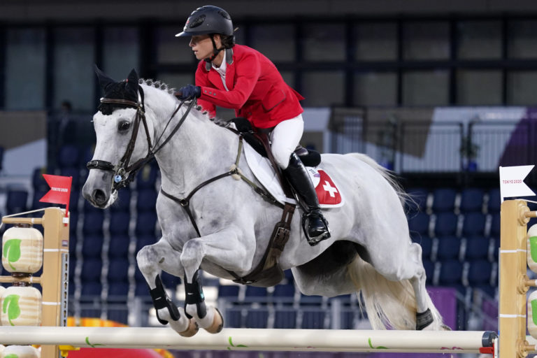 Švajčiarsky jazdec Melody Johner na koni Toubleu de Rueire počas skokov na letnej olympiáde v Tokiu. Tokio, 2. august 2021. Foto: SITA/AP