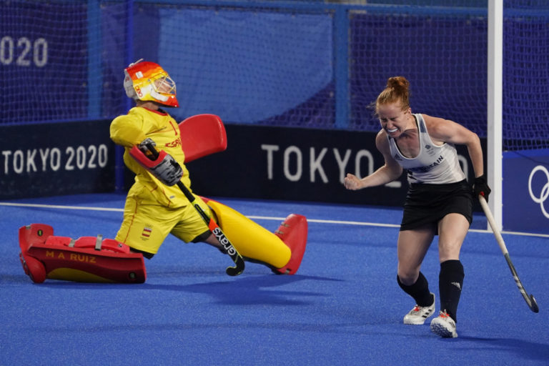 Britská reprezentantka Sarah Louise Jonesová (8) oslavuje gól do brány španielskej gólmanky Mariae de los Angeles Ruiz Castillovej (1) počas zápasu v pozemnom hokeji na letnej olympiáde v Tokiu. Tokio, 2. august 2021. Foto: SITA/AP