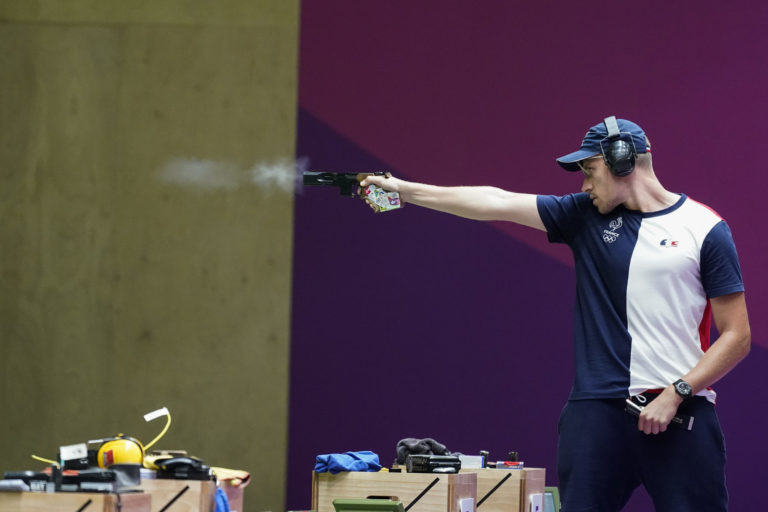 Francúz Jean Quiquampoix získal zlato v kategórii rýchlopalnej pištoli na 25 m na letnej olympiáde v Tokiu. Tokio, 2. august 2021. Foto: SITA/AP.