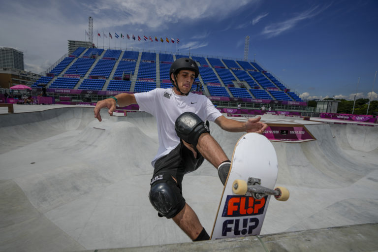 Americký reprezentakt Cory JuneauStates predvádza svoje číslo v skateboardingu na letnej olympiáde v Tokiu. Tokio, 2. august 2021. Foto: SITA/AP