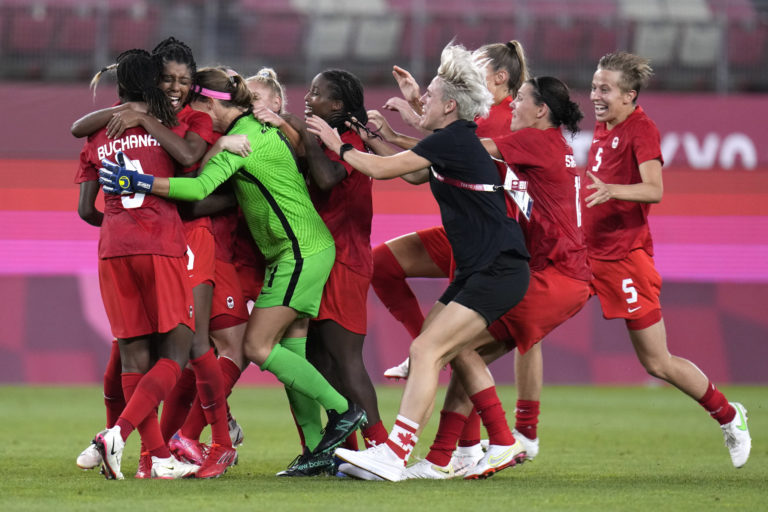 Kanadské futbalistky sa tešia z víťazstva nad Američankami počas semifinálového zápasu na letnej olympiáde v Tokiu. Kashima, 2. august 2021. Foto: SITA/AP.