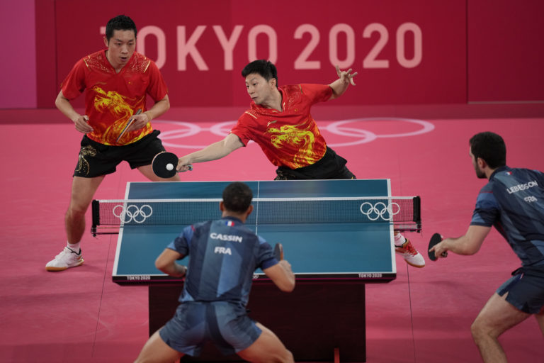 Čínski hráči stolného tenisu Xu Xin (vľavo) a Ma Long počas zápasu proti Francúzom Lebessonovi Emmanuelovi a Alexandreovi Cassinovi na letnej olympiáde v Tokiu. Tokio, 2. august 2021. Foto: SITA/AP.