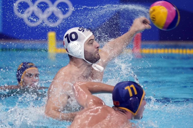 Srbský reprezentan Filip Filipovic (10) hádže loptu počas zápasu vodného póla mužov proti Čiernej Hore na letnej olympiáde v Tokiu. Tokio, 2. august 2021. Foto: SITA/AP.
