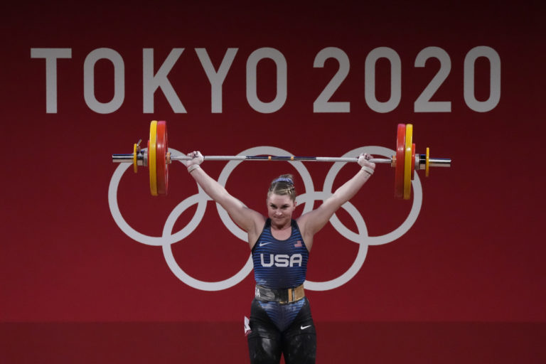 Američanka Martha Ann Rogers počas vzpierania žien do 89 kg na letnej olympiáde v Tokiu. Tokio, 2. august 2021. Foto: SITA/AP.