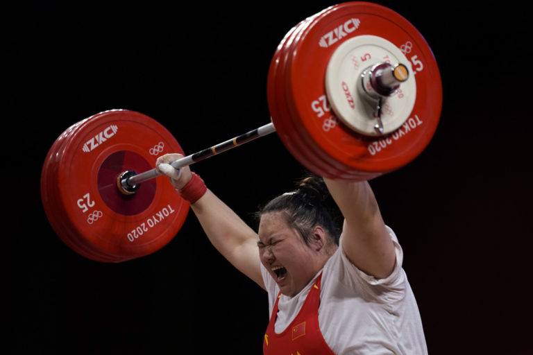 Čínska reprezentantka Li Wenwenová vyhrala zlaqtú medailu vzpieraní žien +87 kg na letnej olympiáde v Tokiu. Tokio, 2. august 2021. Foto: SITA/AP