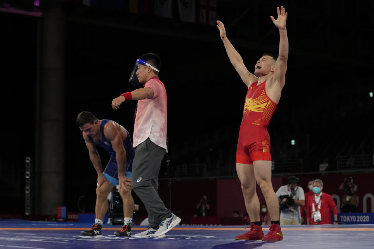 Čínsky reprezentan Sailike Walihan (vpravo) sa teší z výhry nad Ukrajincom Lenurom Temirovom v kategórii Gr-rím. štýl do 60 kg na letnej olympiáde v Tokiu. Tokio, 2. august 2021. Foto: SITA/AP