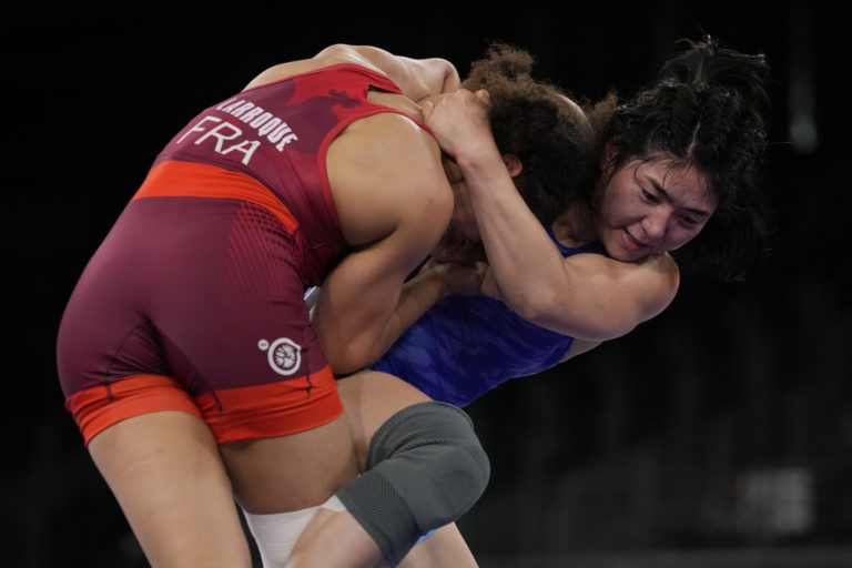 Mongolská reprezentantka Battsetseg Soronzonboldová (vpravo) počas súboja s Francúzkou Kuombou Larroqueovou v zápasení vo voľnom štýle do 68 kg na letnej olympiáde v Tokiu. Tokio, 2. august 2021. Foto: SITA/AP.