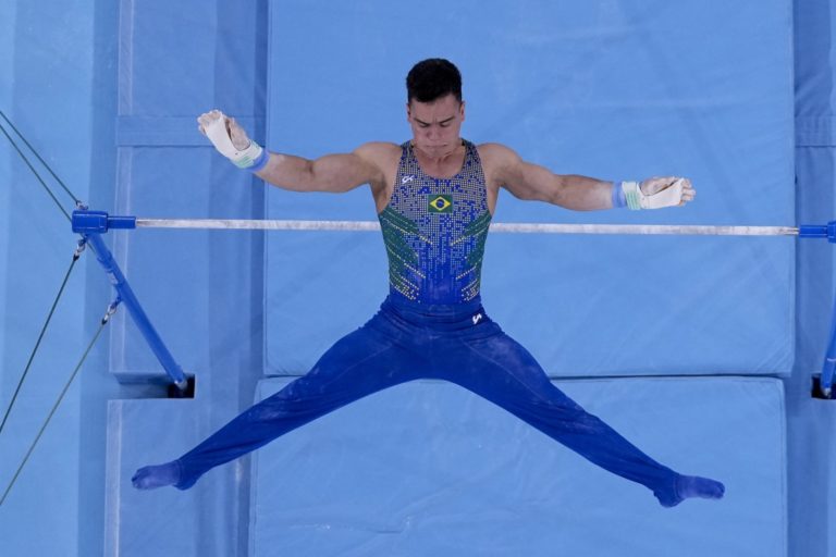 Brazílsky gymnasta Caio Souza počas finálového súboja na hrazde na letnej olympiáde v Tokiu. Tokio, 28. júl 2021. Foto: SITA/AP