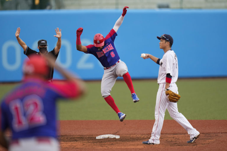 Radosť bejzbalistu Dominikánskej republiky Ericka Mejia počas zápasu proti Japonsku na letnej olympiáde v Tokiu. Tokio, 28. júl 2021. Foto: SITA/AP