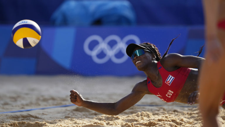 Kubánska plážová volejbalistka Leila Consuelo Martinez Ortega sa hádže za loptou počas letnej olympiády v Tokiu. Tokio, 28. júla 2021. Foto: SITA/AP