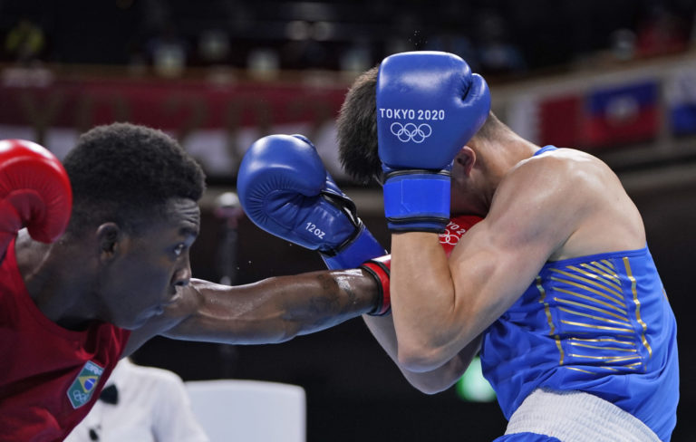 Brazílčan Keno Machado a Číňan Chen Daxiang (v modrom) počas prípravného zápasu v poloťažkej váhe na letnej olympiáde v Tokiu. Tokio, 28. júl 2021. Foto: SITA/AP