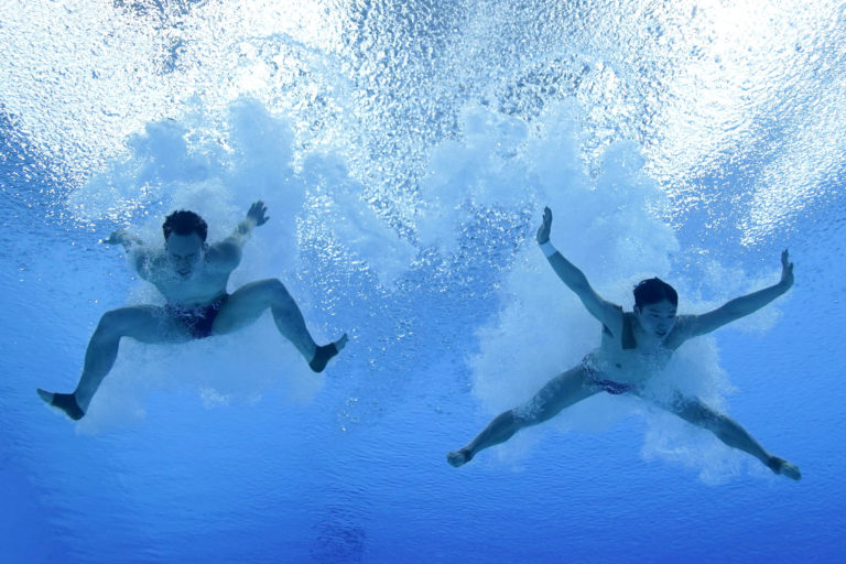 Čínski víťazi zlatej medaily Wang Zongyuan a Xie Siyi v disciplíne synchronizovaný 3-metrový odrazový mostík na letnej olympiáde v Tokiu. Tokio, 28. júl 2021. Foto: SITA/AP