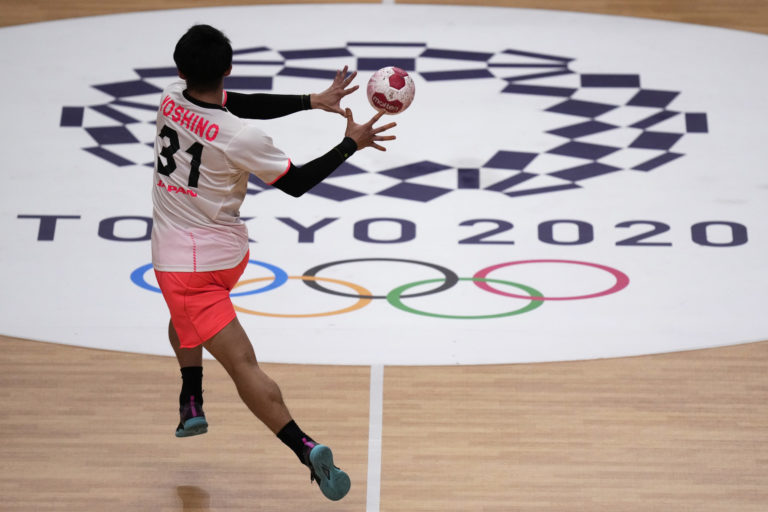Japonský hádzanár Tatsuki Yoshino hádže loptu počas zápasu skupiny B mužov proti Egyptu na letnej olympiáde v Tokiu. Tokio, 28. júl 2021. Foto: SITA/AP