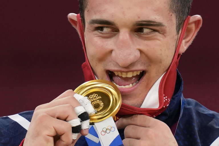 Gruzínsky džudista Lasha Bekauri sa chystá zakusnúť do zlatej medaily na letnej olympiáde v Tokiu. Tokio, 28. júl 2021 Foto: SITA/AP