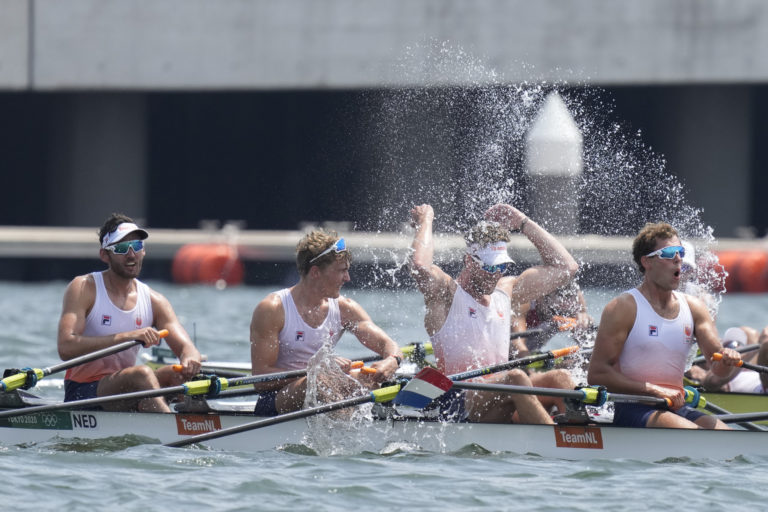 Radosť holandských reprezentantov Lucasa Theodoora Dirka Uittenbogaarda, Abeho Wiersma, Toneho Wietena a Koena Metsemakersa so zisku zlatej medaily v štvorboji na letnej olympiáde v Tokiu. Tokio, 28. júl 2021. Foto: SITA/AP