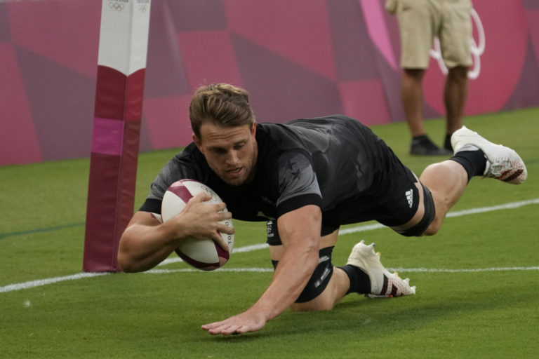 Novozélandský reprezentant Scott Curry skóruje počas ragbyového zápasu proti Fidži na letnej olympáde v Tokiu. Tokio, 28. júl 2021. Foto: SITA/AP
