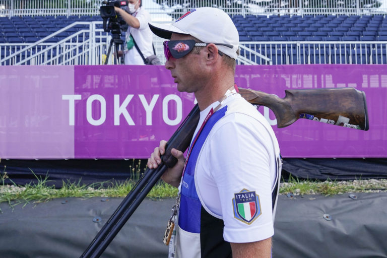 Taliansky strelec Mauro de Filippis odchádza zo strelnice na letnej olympiáde v Tokiu. Tokio, 28. júl 2021. Foto: SITA/AP
