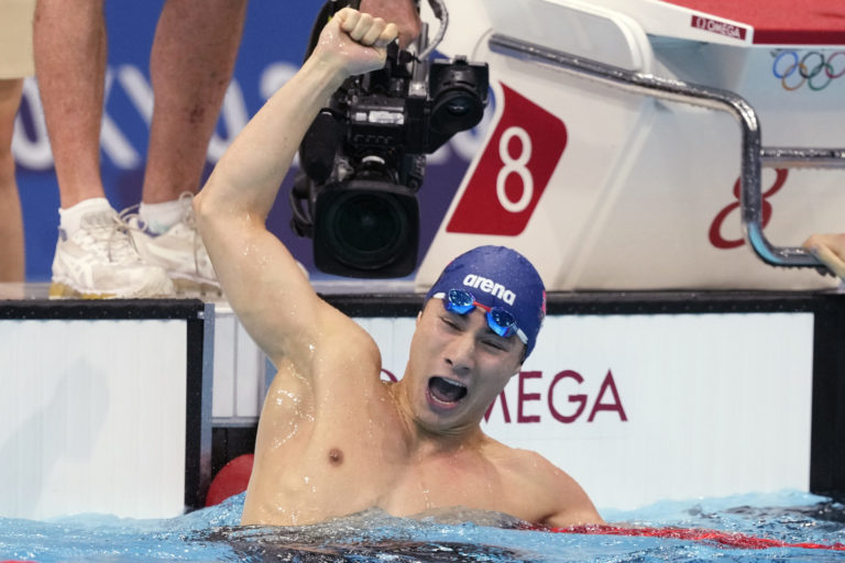 Radosť nórskeho plavba Tomoea Hvasa po víťazstve v disciplíne 200 m voľný štýl na letnej olympiáde v Tokiu. Tokio, 28. júl 2021. Foto: SITA/AP