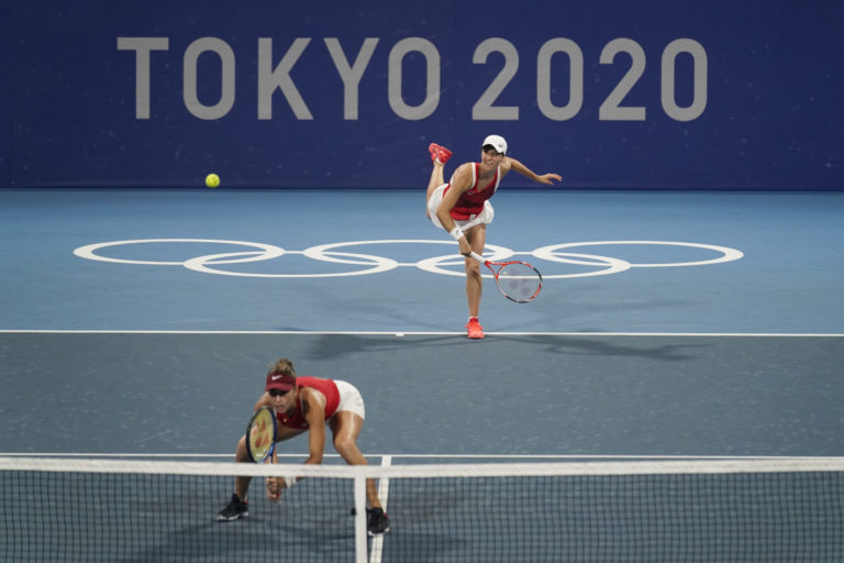 Švajčiarske tenistky team Viktorija Golubičová (vpravo) a Belinda Benčičová počas zápasu proti Austrálčankám vo štvorhre žien na letnej olympiáde v Tokiu. Foto: SITA/AP
