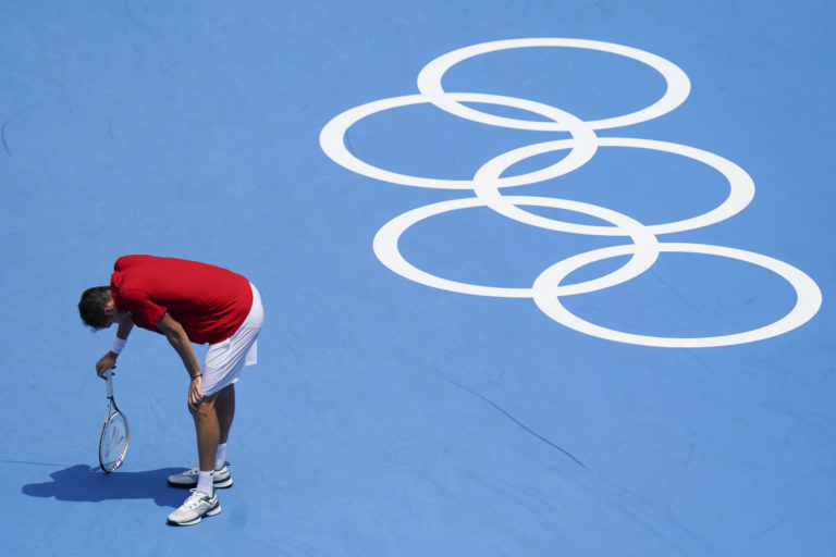Ruský tenista Daniil Medvedev sa pre horúčavy musel niekoľkokrát oprieť o raketu počas súboja s Talianom Fabiom Fogninim na letnej olympiáde v Tokiu. Tokio, 28. júl 2021 Foto: SITA/AP